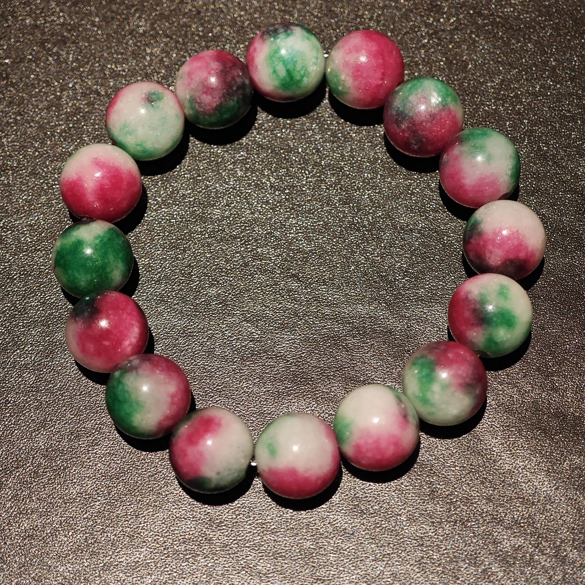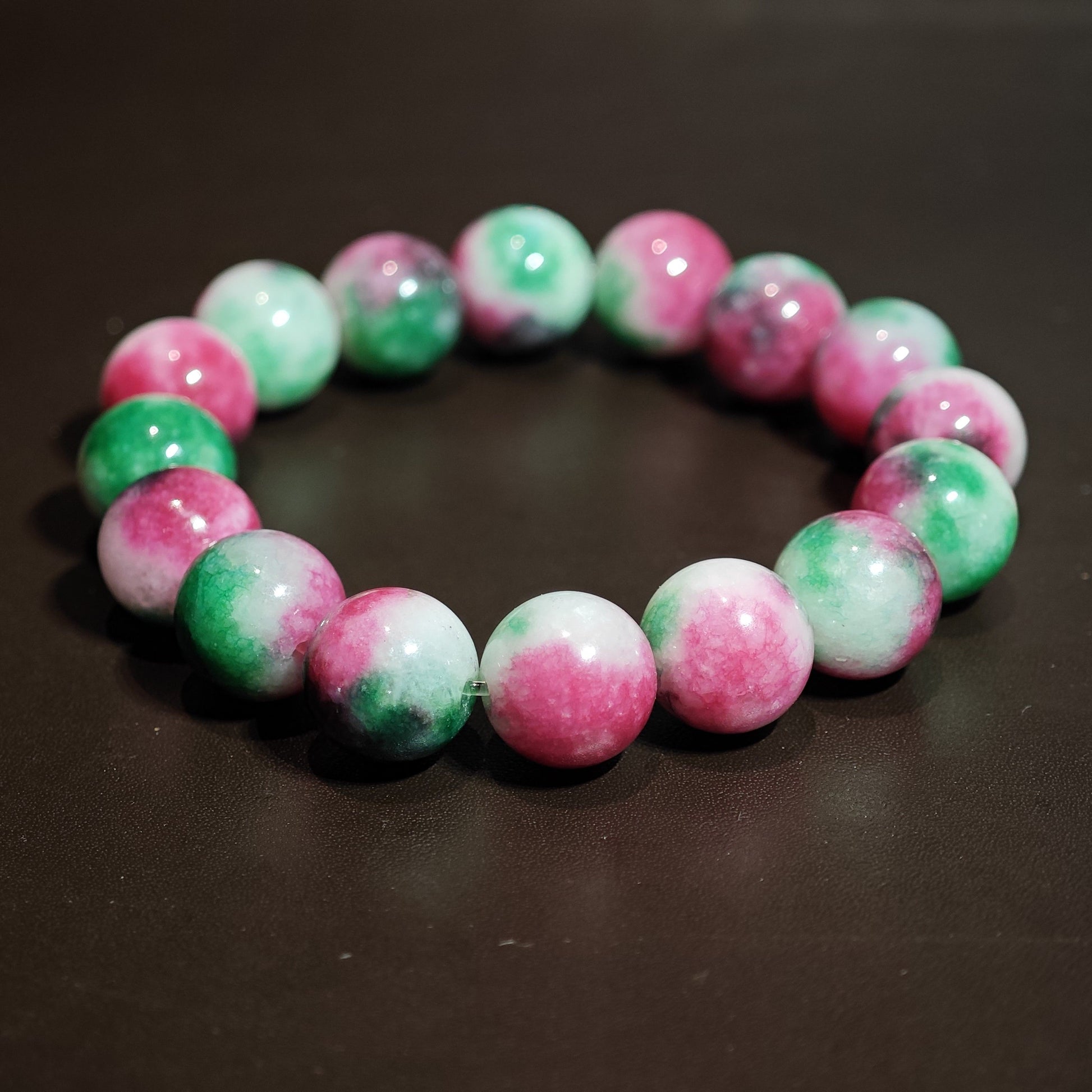 This bracelet features 12mm beads made from Bi-Colored Tourmaline, a gemstone known for its captivating dual-toned appearance. The beads display a harmonious blend of green and pink hues, resembling the beauty of nature’s palette. Each bead is carefully polished to enhance its natural vibrancy, allowing the colors to shine through with a smooth, matte finish.