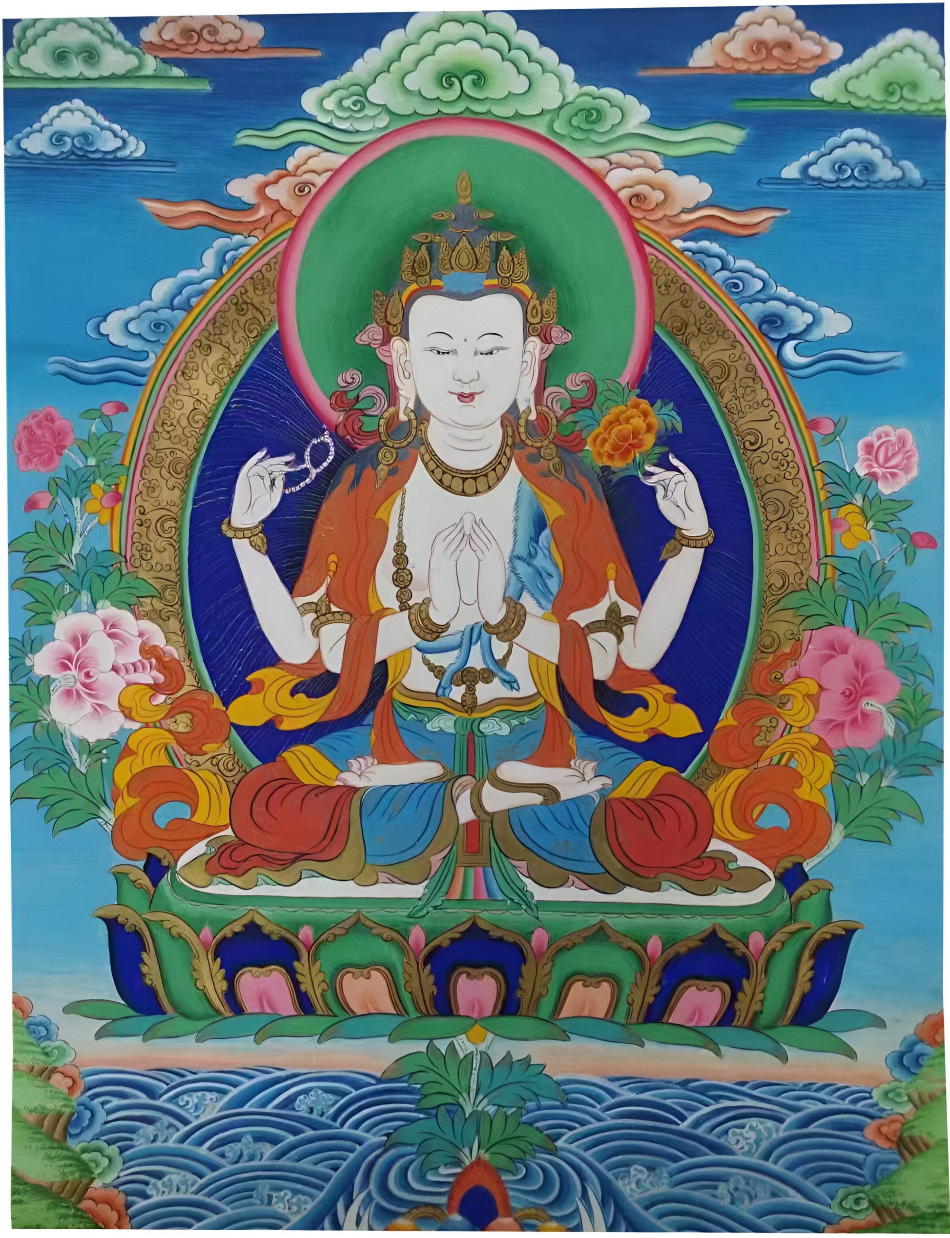 Surrounded by blooming flowers and peaceful waters, the vibrant colors and intricate details of this thangka create a powerful image that invites tranquility and spiritual reflection. The background elements, including the flowers and serene landscape, symbolize the purity and boundless compassion that Chenrezig embodies.