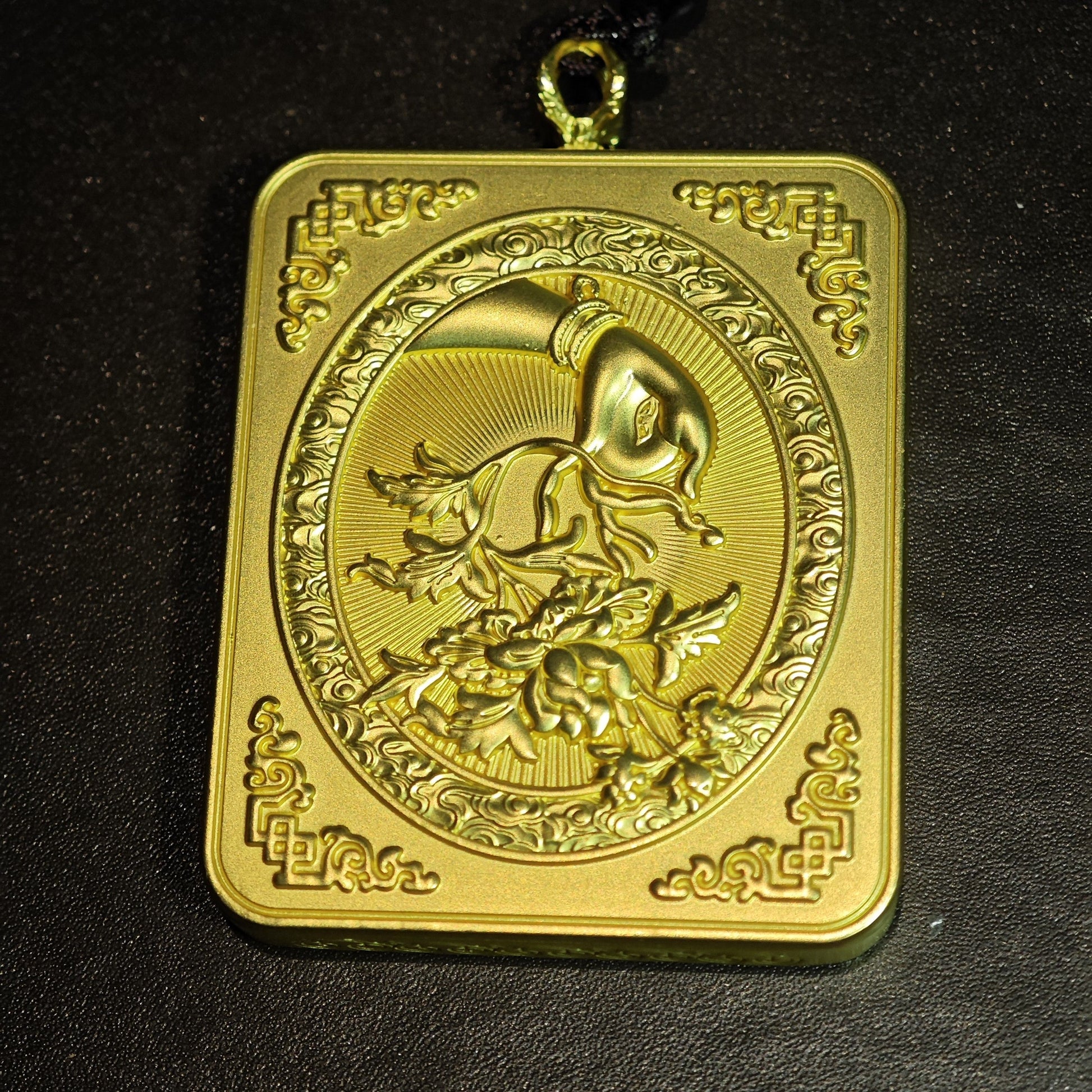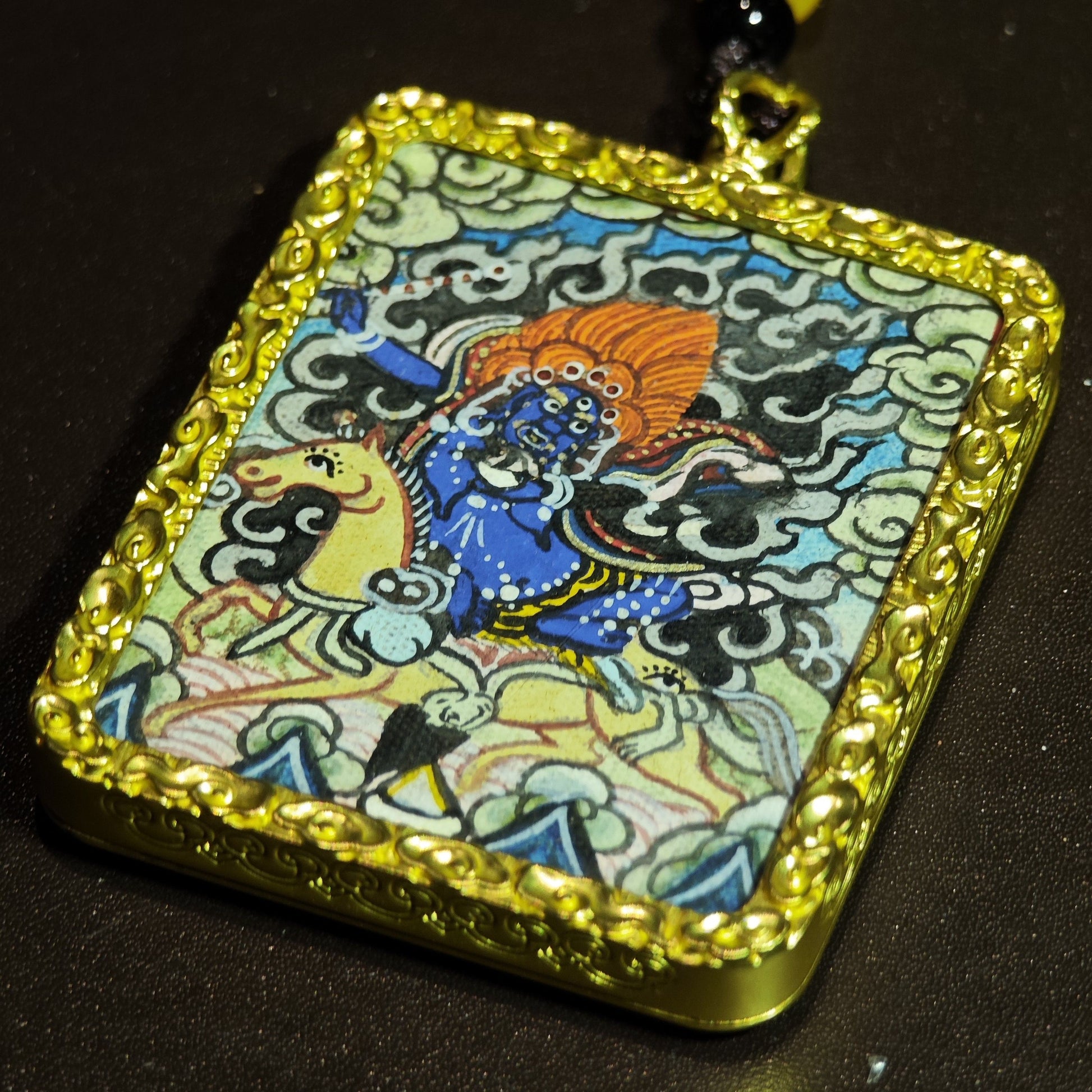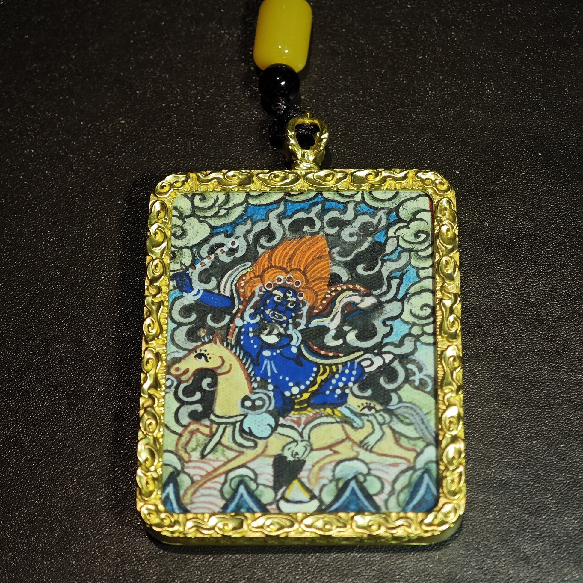 Experience the protective power of Tibetan Buddhism with our handcrafted Thangka Pendant(GAWU) featuring Mahākāla. This stunning pendant showcases a detailed depiction of a Mahākāla riding a horse, symbolizing strength and warding off negative energies. Encased in an elegant gold frame, this pendant not only serves as a spiritual talisman but also as a beautiful piece of jewelry. Adorned with yellow and black beads, it adds a touch of color and sophistication to your style. Perfect for daily wear or special occasions, this pendant offers both aesthetic appeal and spiritual significance, making it a unique addition to your collection.